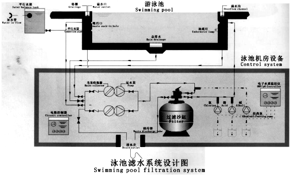 泳池回水從主回水格柵先經(jīng)毛發(fā)聚集器,循環(huán)泵將水中毛發(fā)、大的懸浮物截留住,以免毛發(fā)纏繞泵的葉輪,影響后繼設(shè)備運(yùn)行。出水加入混凝劑后,在管道內(nèi)發(fā)生混合反應(yīng),將水中微小懸浮物凝聚,產(chǎn)生花經(jīng)高速過(guò)濾器后襯過(guò)濾截留。后經(jīng)過(guò)換熱器,池水部分加熱后,與另一部分混合。此時(shí)加入消毒劑,以殺滅水中細(xì)菌,保持一定的余氯量,并加入除藻劑,避免池水發(fā)綠,并調(diào)節(jié)PH值,然后池水重新回到泳池。以上是成熟的游泳池循環(huán)水處理工藝。