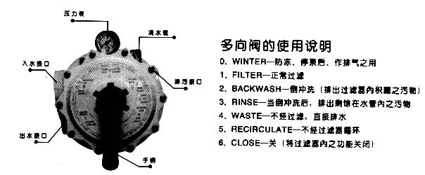 7、砂缸頭多向閥的使用說(shuō)明:(詳見(jiàn)下圖)