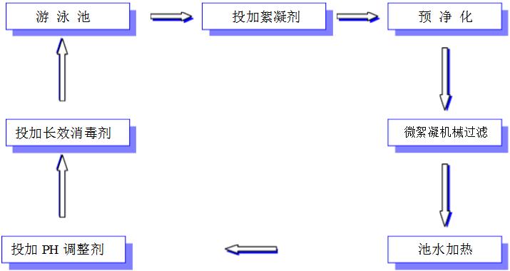 游泳池內的水通過池底回水管道,經毛發聚集器。去除毛發、紙屑、雜草及大塊顆粒狀雜物,再有加藥裝置加入混凝劑,經循環水泵的葉輪攪拌混合后進入過濾器,利用過濾器內的濾料濾去懸浮物,過濾后的水再經消毒處理(冬季循環水需經換熱器加熱),使之達到國家規定的游泳池水質標準后,送回游泳池再使用。游泳池水就這樣連續不斷地進行著凈化處理,再使用再凈化的循環過程。