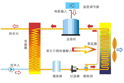 泳池熱泵機組系統工作過程:處于低壓液態循環工質(如氟利昂R22、404a)流經泳池熱泵機組的蒸發器時蒸發,此時從低溫熱源處吸收熱量,變成蒸氣后,流進壓縮機,經過壓縮機壓縮后升溫升壓,變成高溫、高壓蒸氣,排出壓縮機,蒸汽流經泳池熱泵機組冷凝器,在冷凝器中,將從蒸發器中吸取的熱量和壓縮機耗功所相當的那部分熱量排出,傳遞給流經泳池熱泵機組的鈦管中的冷水,使其溫度提高。循環工質蒸汽冷凝降溫后變成液相,高壓液體流經膨脹閥后,壓力下降,變成低壓液體,低壓液相工質流入蒸發器,由于沸點低,因而很容易從周圍環境吸收熱量而再蒸發,又形成低溫低壓蒸汽,依此不斷地進行重復循環。就能使低溫熱量連續不斷地傳遞到高溫熱源(水)處,以滿足泳池水加熱恒溫需求。