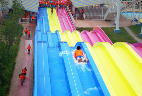 彩虹競(jìng)賽滑梯同樣是一類(lèi)非常經(jīng)典的水上樂(lè)園游玩水滑梯,多可以多道并列設(shè)計(jì),一般為3~10道,可以用身體或浮墊滑行。參與者可以同時(shí)出發(fā)進(jìn)行比賽,滑道中間會(huì)設(shè)計(jì)一系列刺激的小坡,參與者們都將一一通過(guò)它們,最終沖向終點(diǎn)線。該設(shè)備的參與和互動(dòng)性非常強(qiáng),同時(shí)具有很強(qiáng)的接待能力,讓游客可以多次參與到比賽當(dāng)中,獲取歡樂(lè)和暢快的獨(dú)特體驗(yàn)。