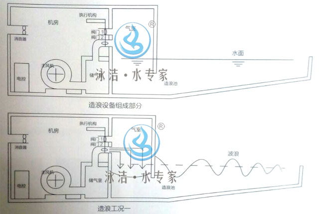 氣壓造浪系統(tǒng)主要蓄壓室、風機、閥門機構、風管系統(tǒng)、電子智能造浪是一項多學科綜合性的設備工程,它涉及空氣動力學、波浪力學、機械學、電氣控制系統(tǒng)學等幾門學科。但關于波浪產生的基本原理,可以形象而通俗的概括為一句成語興風作浪。它與海嘯產生原理基本一致,都是由于壓力的變化而形成波浪。