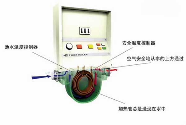 4、加熱器裝有池水溫度控制器及水溫安全控制器,以監測泳池水的溫度及加熱器內被加熱水的溫度,并把泳池水的水溫變化控制在1-2℃之內。